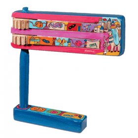 Take a look at the ever-popular Yair Emanuel groggers and thrill as you feel the joy of Purim surging through his colorful designs. There are three magnificent options depicting images of Jerusalem, the story of Purim or a peacock design. A clever twist - the grogger fits into a neat base so it stands proudly upright when not in use.