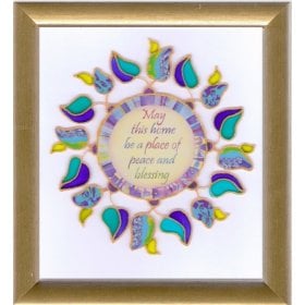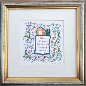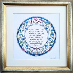 With restrained elegance, she presents us with finely written illuminated Jewish texts that celebrate the special events that are an integral feature of every Jewish home and family. For a housewarming, present one of her home blessings with elegant wording in Hebrew or English. There are beautiful framed wall hangings with boys or girls blessing, giving a special touch to those immortal words. Consider the precious Shema Yisrael prayer or the traditional Aaronic Blessing. Of course, there are also exciting Hamsas and eloquent Trees of Life. Doting grandparents have a special plaque paying tribute to their status as head of the family. There is also a dove of peace portrait and a sparkling image of ancient Jerusalem.