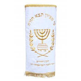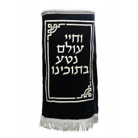 The velvet Torah Mantle covering the Torah Scroll in the synagogue is majestic and impressive. You can order your mantle with personalized embroidery honoring or commemorating individuals, for a place of honor in your synagogue.