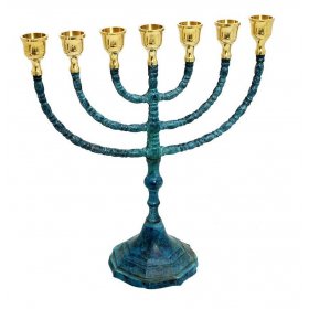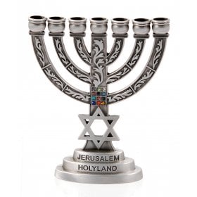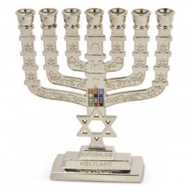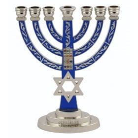 Although most of the Menorahs are a one tone color - gold, yellow or silver – we have not forgotten those who are looking for a dash of color. Look for the Menorah with an oval blue stone that forms a pretty centerpiece on the main branch. Another one – small in size - has a striking blue color with a Jerusalem theme design or enjoy ivory colored enamel shining with sparkling stones.