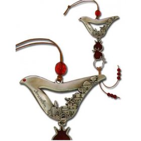 Yealat Chen shares with us her passion for the ever-popular Hamsa, the five-finger symbol that is reputed to protect the home from the effect of the Evil Eye. It displays outstretched fingers and on the palm, Yealat Chen inscribes her words of blessing. There are Home Blessings in Hebrew or English or if you wish to be more specific, go for the blessings for good health and old age. Many of her Hamsas are decorated with colorful stones, adding a distinctive touch of glamor. Birds and doves are also popular themes, bringing their message of tranquility and peaceful co-existence.