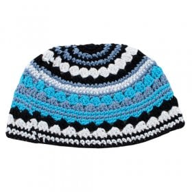 Frik Kippah Thick Crocheted Weave of Black, White and Shades of Blue StripesSize: 9.4"$6.13 -