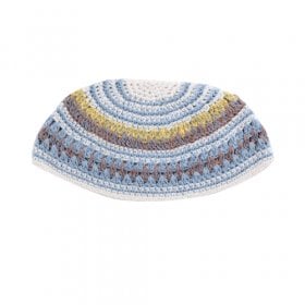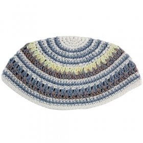 Frik Kippah Thick Crocheted Weave of White, Blue, Gray and Yellow StripesSize: 9.4"$6.13 -