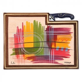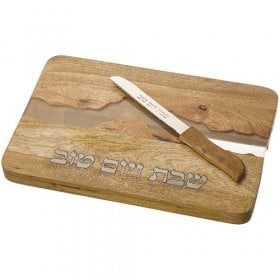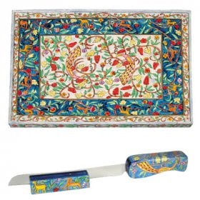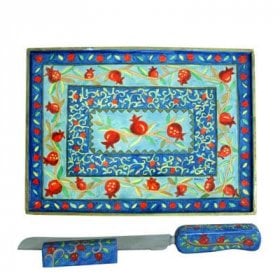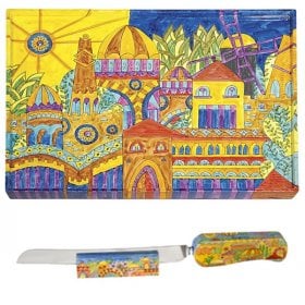 The contemporary boards include some lovely ones in beautiful colors by Dorit Klein, imbuing this item with meaning and artistry. The clean modern lines of her work is refreshing and very attractive. We also offer tempered glass boards which have traditional colorful design, featuring Jerusalem or other Jewish themes. These boards can be dropped from a height to a hard floor and still not break. You can try it, we did! The Yair Emanuel products are hand painted and then lacquered, utilizing Jerusalem, Seven Species and other Judaica themes to enhance this popular product. They come with the option of a matching knife.