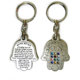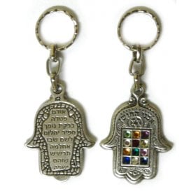 One can send a hamsa keychain to a loved one as a symbol for good luck and protection, great for someone before a big test or job interview! The enamel ones come in lively purple or blue-red colors and the twelve tribe colored stone ones have the Travelers prayer in Hebrew on the other side. The hamsa Judaic keychain is a quality two tone one with a central Hamsa and the word Jerusalem and is sent in an impressive gift box, for that special person.