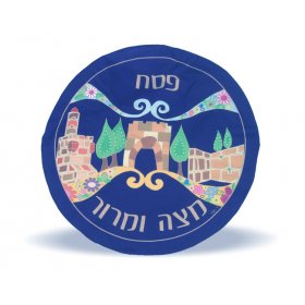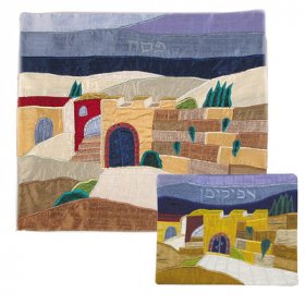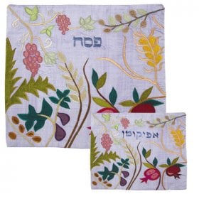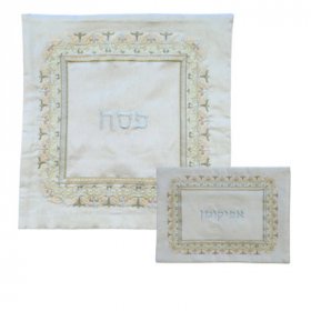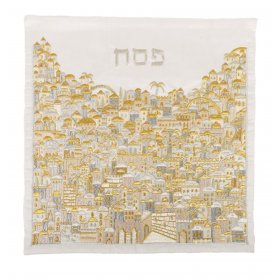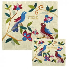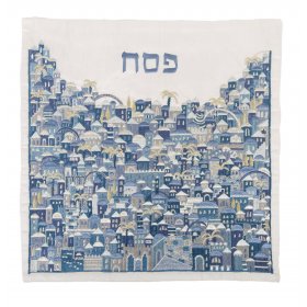 The decorative matching sets for Passover come in two, three and four pieces. The two items are matching covers for the Matza and Afikoman, some of them by the Israeli artist Yair Emanuel, in stunning Judaic themes on raw silk. The three part matching set consists of a Matza and Afikoman cover, in addition to a decorative pillow case. The pillow is placed on the chairs in order to truly recline as kings and the effect is majestic and suitable for this holy night. The fourth item is a small hand washing towel, completing the beautiful effect of this holiday item.