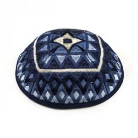 Yair Emanuel Kippah with Silk Embroidered Geometrical Shapes in Shades of Blue$12.84 -