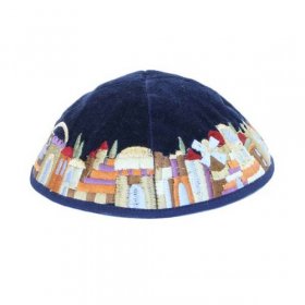 Yair Emanuel Blue Velvet Kippah, Embroidered Jerusalem Images - Colorful$12.34 -