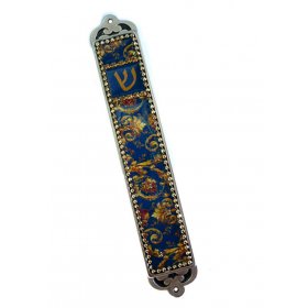 Iris Design Mezuzah Case, Hand Painted Enamel on Pewter, Beaded - Blue and Gold$56.53 -