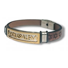 Brown Leather Bracelet, Stars of David - Center Plaque with Jerusalem in Gold$10.95 -