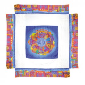 Renowned Israeli Judaica artist, Yair Emanuel, offers us two exquisite Huppah designs. The first features wheat and pomegranates, symbols of growth and bounty, applique’d in shades of gold on a pure silk fabric. In the center are embroidered words describing the joy of the bride and groom. The second, also vividly colored, depicts a border of hand-painted colorful images of Jerusalem. The design is repeated in the center in the glorious harmony of colors that is the Yair Emanuel hallmark.