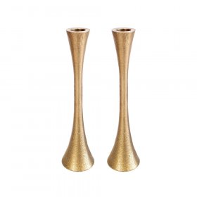 One of the items most associated with Shabbat and Holidays are candlesticks. This is the time when the Jewish woman pours her heart out in prayer, an auspicious time for her pleas, since this is one of the three Mitzvot, or commandments that the Jewish woman received and is much beloved by G-d. After the lighting ceremony, a moving prayer is recited by the mother, for the coming week, for G-d fearing children and other prayers only a mother can present. The sight of the Shabbat table graced with two gently burning candles touches our hearts and spirits, ushering in the holy day, when we spend time with our families and friends around the Shabbat table, with the glowing candles and just talk, reciting experiences from this past week, offering Torah insights, laughing and recharging our spiritual batteries. We offer the most traditional items, in materials such as pewter, nickel, ceramic, aluminium and more plus a great choice of contemporary items from favorite Israeli artists. Take, for example the Flower themed ones by Shraga Landesman, in his tribute to nature, reminiscent of the seven days of creation when all the world and it's inhabitants were created. The contemporary Agayof design utilizes vivid shades and sleek lines for an avant-garde appearance. The handcrafted pewter candlesticks by Ester Shahaf are a tribute to painstaking handwork and detailed emanel work. They are also available in folding travelling versions, all seamlessly crafted and eminently practical. Dorit Klein with her usual elegant and symmetrical design aluminium ones, which are a favorite. The classic Yair Emanuel items can be fitted into each other for a smooth rectangular shape, hand painted with Jewish themes. The filigree designs by Yealat Chen are unusual and of extremely beautiful metalwork, as is the unusual enamel on her pewter and enamel ones. Give a meaningful wedding or hostess gift with these classic Judaica items.