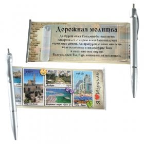 An interesting use of the pen is to attach to it the well-known Travelers’ Prayer, the Tefillat Ha’derech, recited at the beginning of a journey, requesting G-d for Divine protection from all dangers on the road. Instead of searching in the corners of your bag for the text, all you need to do is to whip out your pen and gently unscroll the prayer from the side. Ajudaica offers various options: The prayer in English or Russian adorned with the icon of the Israeli Army or with a map of Israel or pictures of Israeli tourists sites.