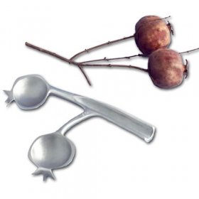 Consider his wide circular plates designed to hold the apple slices and honey. There is a choice of color for the glass bowls holding the honey. Pomegranates, another symbolic Rosh Hashanah food, are prominently featured in his collection. Some of his honey dishes are pomegranate shaped. One has Shanah Tovah written on the surface in an ancient Jewish font. His most intriguing honey dish is a pomegranate shaped spoon with a twig design – sure to be a good start for conversation at your table.