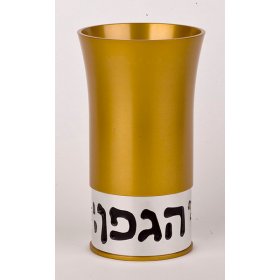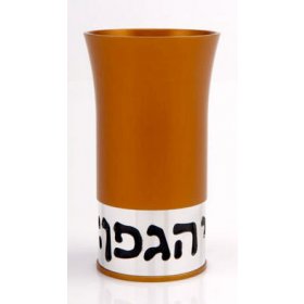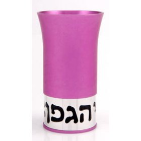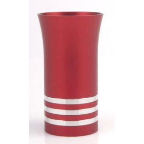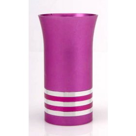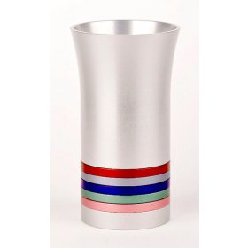 The Kiddush cups, produced from anodized aluminum, are strikingly shaped. They have a fashionable matt finish and an elegant silver stripe or black lettering at the base. The Teflon-coating ensures an easy clean without any after-taste. You will find silver, gold, black, red, orange, pink and green colors - each one a stunning addition to any Shabbat table.