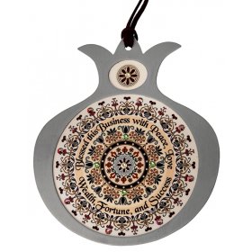 Delightful pomegranate shaped wall plaques with intricate wheels of life holding business blessings in Hebrew or English Elegant business Hamsa wall hangings, magnificently decorated with more pomegranates and words of blessing Distinguished plaques with appropriate texts for a physician, lawyer or business. Dove images add an elegant finishing touch Stunningly impressive Floating Letters in silver or gold color, displaying business blessings in bold Hebrew letters. Comes in two sizes.