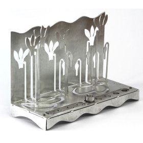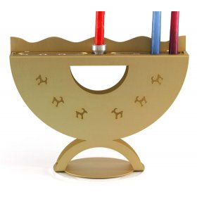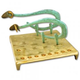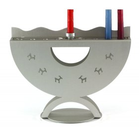On the aJudaica website, you will find a selection of 25 Menorahs - each one a unique form of art. Most are formed from metal or wood. The subdued silver, gold and blue colors give a natural sheen. Designs feature herons perched on a branch, awaiting the future with anticipation, grazing deer searching for food, birds on a tree branch singing their song. Prancing ibex give an impression of movement. A lonely deer gazes at a cactus plant on which a bird is perched – unafraid.