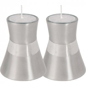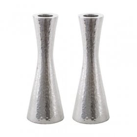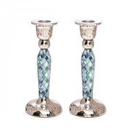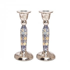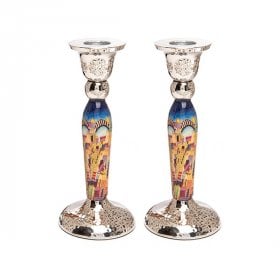 One of the items most associated with Shabbat and Holidays are candlesticks. This is the time when the Jewish woman pours her heart out in prayer, an auspicious time for her pleas, since this is one of the three Mitzvot, or commandments that the Jewish woman received and is much beloved by G-d. After the lighting ceremony, a moving prayer is recited by the mother, for the coming week, for G-d fearing children and other prayers only a mother can present. The sight of the Shabbat table graced with two gently burning candles touches our hearts and spirits, ushering in the holy day, when we spend time with our families and friends around the Shabbat table, with the glowing candles and just talk, reciting experiences from this past week, offering Torah insights, laughing and recharging our spiritual batteries. We offer the most traditional items, in materials such as pewter, nickel, ceramic, aluminium and more plus a great choice of contemporary items from favorite Israeli artists. Take, for example the Flower themed ones by Shraga Landesman, in his tribute to nature, reminiscent of the seven days of creation when all the world and it's inhabitants were created. The contemporary Agayof design utilizes vivid shades and sleek lines for an avant-garde appearance. The handcrafted pewter candlesticks by Ester Shahaf are a tribute to painstaking handwork and detailed emanel work. They are also available in folding travelling versions, all seamlessly crafted and eminently practical. Dorit Klein with her usual elegant and symmetrical design aluminium ones, which are a favorite. The classic Yair Emanuel items can be fitted into each other for a smooth rectangular shape, hand painted with Jewish themes. The filigree designs by Yealat Chen are unusual and of extremely beautiful metalwork, as is the unusual enamel on her pewter and enamel ones. Give a meaningful wedding or hostess gift with these classic Judaica items.