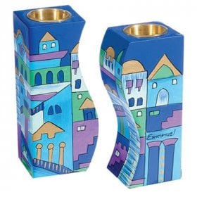Yair Emanuel Hand-Painted Wood Fitted Candlesticks, Blue - Jerusalem ViewsSize:10x7x4cm/ 4x 2.7x 1.6”$35.40 -