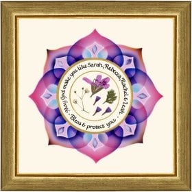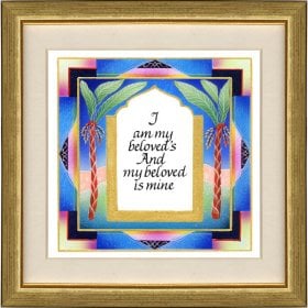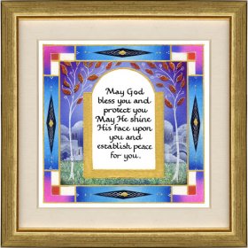 With restrained elegance, she presents us with finely written illuminated Jewish texts that celebrate the special events that are an integral feature of every Jewish home and family. For a housewarming, present one of her home blessings with elegant wording in Hebrew or English. There are beautiful framed wall hangings with boys or girls blessing, giving a special touch to those immortal words. Consider the precious Shema Yisrael prayer or the traditional Aaronic Blessing. Of course, there are also exciting Hamsas and eloquent Trees of Life. Doting grandparents have a special plaque paying tribute to their status as head of the family. There is also a dove of peace portrait and a sparkling image of ancient Jerusalem.