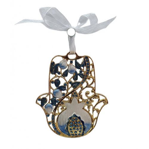 Bring the pomegranate, blessed fruit of the Land of Israel, to your home with this stunning crystal wall decoration. Within the outline of the good luck Hamsa, the artist has designed a gold swirling shape that incorporates luscious looking pomegranates with a single richly seeded pomegranate at the base.