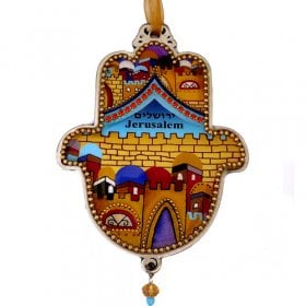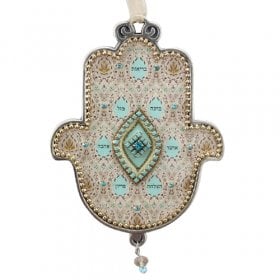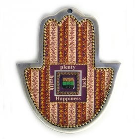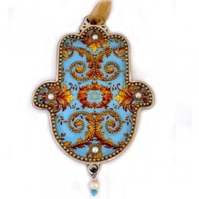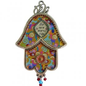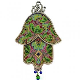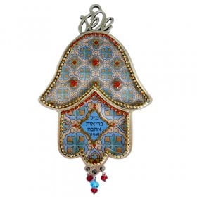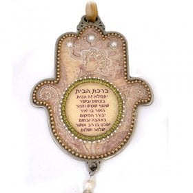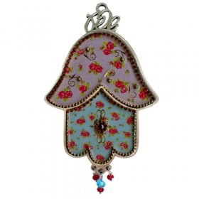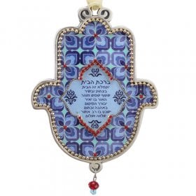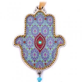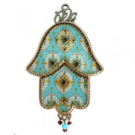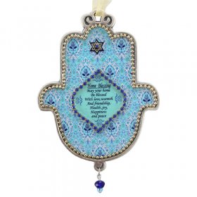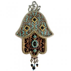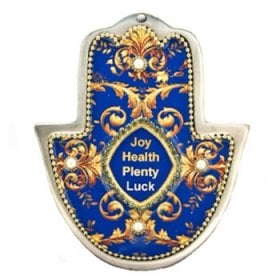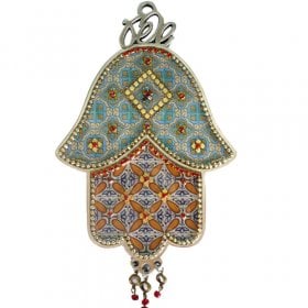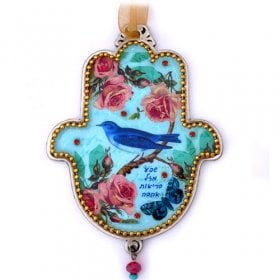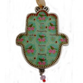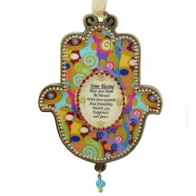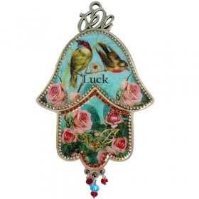 Iris offers a wide selection of Hamsas and wall hangings - a huge choice of colors and styles with something for every taste. Many of the richly elaborate themes are in a swirling Oriental-style. You will find a wide variety of Hamsas, the traditional Hand motif of protection, reputed to shield the home from the Evil Eye. Some have an added symbol or word of blessing in the center. Others combine with an ornate Home Blessing – in Hebrew and English. There are Hamsas with texts suitable for presentation as gifts for a newborn. There is a choice of bejeweled doves and lovebirds, each one elaborately hand-painted and decorated with beads, crystal stones and words of blessing.