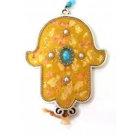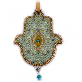 Iris Design Hand Painted Wall Hamsa, Leaf Design on Gold - Beads and CrystalsSize: 12 cm / 4.7"$58.56 -