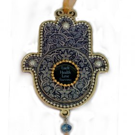 Iris Design Wall Hamsa with Blessings, Gold and Blue - Beads and Crystals$62.83 - $70.52 -