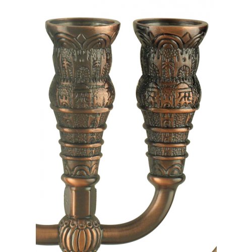 Here is a charming bronze colored metal seven branch Menorah. On the two-layered, six sided base, is engraved iconic Jerusalem images with the words "Jerusalem" and "Holyland". The theme repeats on the candle holders. The smooth branches and the magnificent bronze color gives a pleasing antique look. Available in two sizes