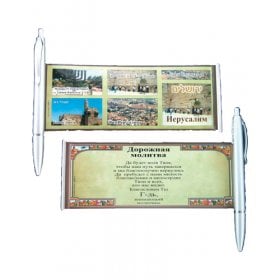An interesting use of the pen is to attach to it the well-known Travelers’ Prayer, the Tefillat Ha’derech, recited at the beginning of a journey, requesting G-d for Divine protection from all dangers on the road. Instead of searching in the corners of your bag for the text, all you need to do is to whip out your pen and gently unscroll the prayer from the side. Ajudaica offers various options: The prayer in English or Russian adorned with the icon of the Israeli Army or with a map of Israel or pictures of Israeli tourists sites.