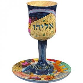 In the center of the Seder table prominently stands a large-size Cup of Elijah. Later on in the evening, this is filled with wine and one of the children present is honored to open the door whilst everyone stands and fervently recites a prayer inviting the Prophet Elijah to enter and announce the coming of the final redemption. Always popular is Yair Emanuel’s Elijah cup, hand painted in a vivid colorful design. Across the front in bold letters is written in Hebrew - Eliyahu – Elijah.