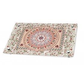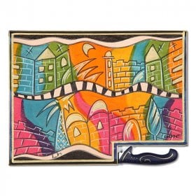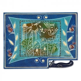 The contemporary boards include some lovely ones in beautiful colors by Dorit Klein, imbuing this item with meaning and artistry. The clean modern lines of her work is refreshing and very attractive. We also offer tempered glass boards which have traditional colorful design, featuring Jerusalem or other Jewish themes. These boards can be dropped from a height to a hard floor and still not break. You can try it, we did! The Yair Emanuel products are hand painted and then lacquered, utilizing Jerusalem, Seven Species and other Judaica themes to enhance this popular product. They come with the option of a matching knife.