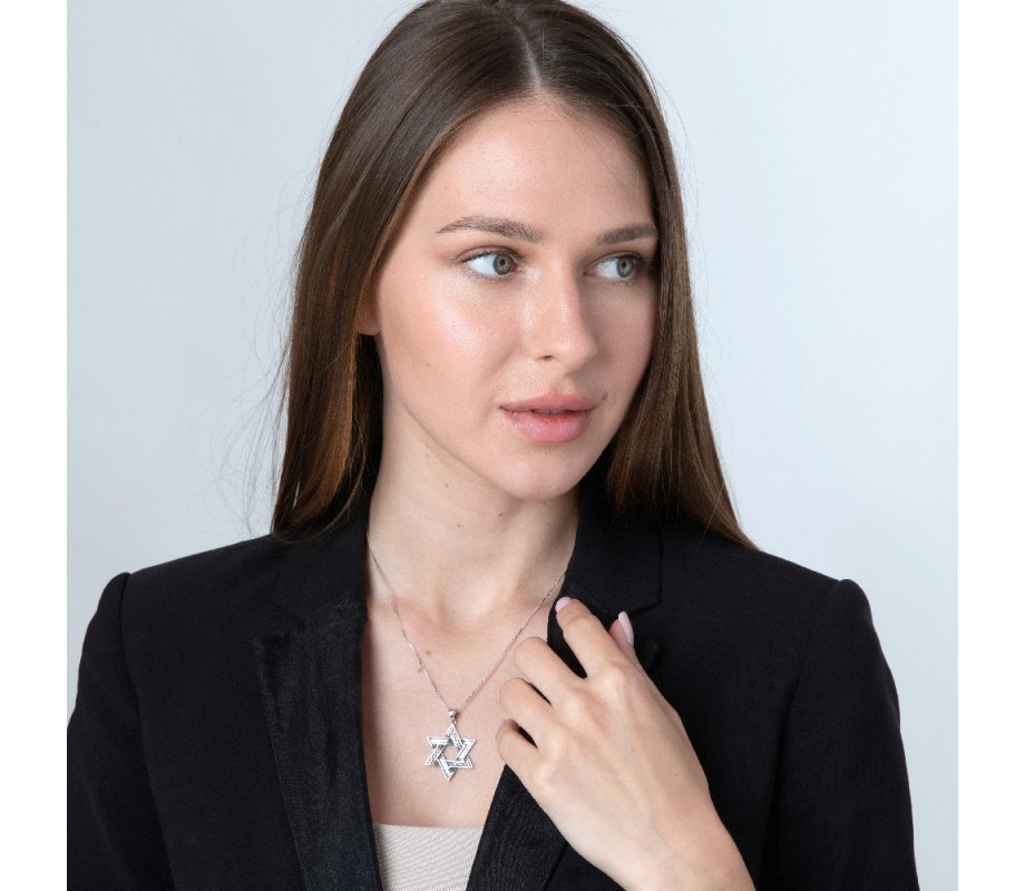 The six-pointed Star of David, with two interlocking triangles, is the eternal symbol of the Jewish nation. As a pendant, it is a proud display of Jewish loyalty and identity. This Star of David, crafted from sterling silver, elegantly contrasts the two triangles as dark smooth silver overlapps raised beads in a lighter silver color.