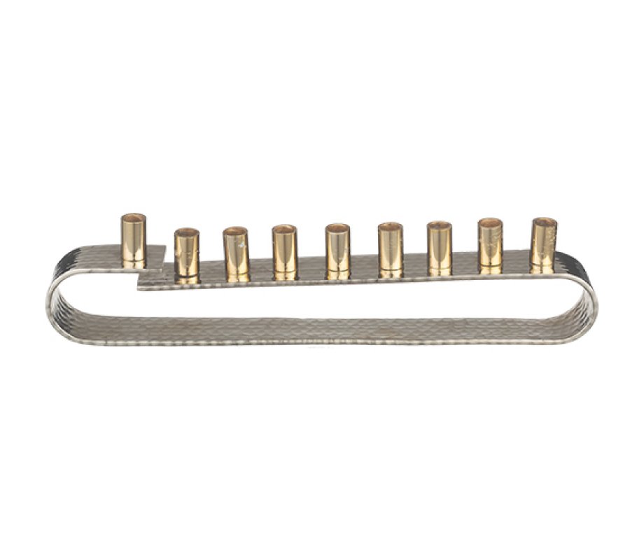 Enhance your Chanukah experience with this contemporary style menorah featuring a loop-style base. On top are the candle holders in a row with the shamash holder. Made from quality aluminum this is a menorah that will radiate candle-light to your home.