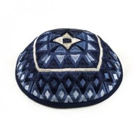 Yair Emanuel Kippah with Silk Embroidered Geometrical Shapes in Shades of Blue$12.84 -