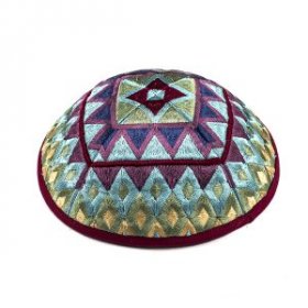 Yair Emanuel Kippah, Maroon with Embroidered Colorful Jerusalem Images$12.84 -