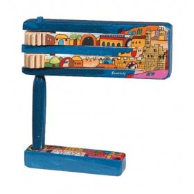 Take a look at the ever-popular Yair Emanuel groggers and thrill as you feel the joy of Purim surging through his colorful designs. There are three magnificent options depicting images of Jerusalem, the story of Purim or a peacock design. A clever twist - the grogger fits into a neat base so it stands proudly upright when not in use.