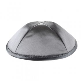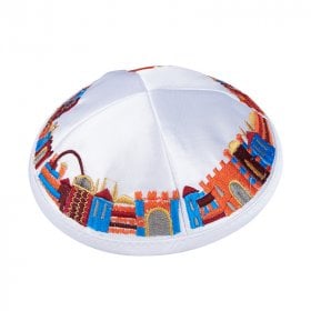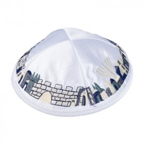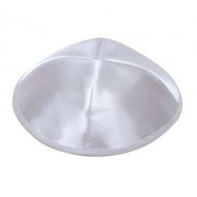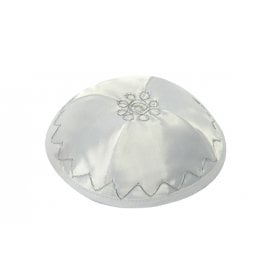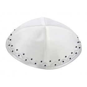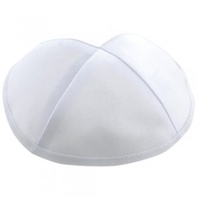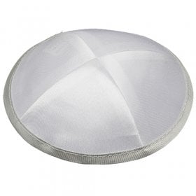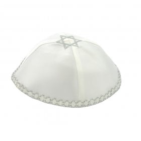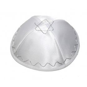The satin Kippah is worn at festive occasions such as Jewish weddings or for prayer services. Some are plain white with a metallic silver thread border, and others have a decorative Star of David or Mazal Tov design. Others sport a Jerusalem theme border design in gold and silver threads. The plain white Kippot are available to order in bulk, with gold or silver letter personalization to commemorate a wedding or Bar Mitzvah, to be distributed among the guests as a distinctive memento. These Kippot are classic and dignified, and are of superior quality.