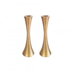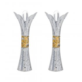 One of the items most associated with Shabbat and Holidays are candlesticks. This is the time when the Jewish woman pours her heart out in prayer, an auspicious time for her pleas, since this is one of the three Mitzvot, or commandments that the Jewish woman received and is much beloved by G-d. After the lighting ceremony, a moving prayer is recited by the mother, for the coming week, for G-d fearing children and other prayers only a mother can present. The sight of the Shabbat table graced with two gently burning candles touches our hearts and spirits, ushering in the holy day, when we spend time with our families and friends around the Shabbat table, with the glowing candles and just talk, reciting experiences from this past week, offering Torah insights, laughing and recharging our spiritual batteries. We offer the most traditional items, in materials such as pewter, nickel, ceramic, aluminium and more plus a great choice of contemporary items from favorite Israeli artists. Take, for example the Flower themed ones by Shraga Landesman, in his tribute to nature, reminiscent of the seven days of creation when all the world and it's inhabitants were created. The contemporary Agayof design utilizes vivid shades and sleek lines for an avant-garde appearance. The handcrafted pewter candlesticks by Ester Shahaf are a tribute to painstaking handwork and detailed emanel work. They are also available in folding travelling versions, all seamlessly crafted and eminently practical. Dorit Klein with her usual elegant and symmetrical design aluminium ones, which are a favorite. The classic Yair Emanuel items can be fitted into each other for a smooth rectangular shape, hand painted with Jewish themes. The filigree designs by Yealat Chen are unusual and of extremely beautiful metalwork, as is the unusual enamel on her pewter and enamel ones. Give a meaningful wedding or hostess gift with these classic Judaica items.