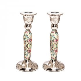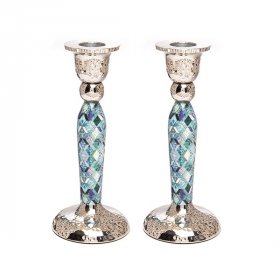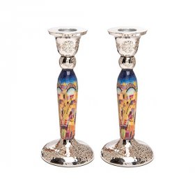 One of the items most associated with Shabbat and Holidays are candlesticks. This is the time when the Jewish woman pours her heart out in prayer, an auspicious time for her pleas, since this is one of the three Mitzvot, or commandments that the Jewish woman received and is much beloved by G-d. After the lighting ceremony, a moving prayer is recited by the mother, for the coming week, for G-d fearing children and other prayers only a mother can present. The sight of the Shabbat table graced with two gently burning candles touches our hearts and spirits, ushering in the holy day, when we spend time with our families and friends around the Shabbat table, with the glowing candles and just talk, reciting experiences from this past week, offering Torah insights, laughing and recharging our spiritual batteries. We offer the most traditional items, in materials such as pewter, nickel, ceramic, aluminium and more plus a great choice of contemporary items from favorite Israeli artists. Take, for example the Flower themed ones by Shraga Landesman, in his tribute to nature, reminiscent of the seven days of creation when all the world and it's inhabitants were created. The contemporary Agayof design utilizes vivid shades and sleek lines for an avant-garde appearance. The handcrafted pewter candlesticks by Ester Shahaf are a tribute to painstaking handwork and detailed emanel work. They are also available in folding travelling versions, all seamlessly crafted and eminently practical. Dorit Klein with her usual elegant and symmetrical design aluminium ones, which are a favorite. The classic Yair Emanuel items can be fitted into each other for a smooth rectangular shape, hand painted with Jewish themes. The filigree designs by Yealat Chen are unusual and of extremely beautiful metalwork, as is the unusual enamel on her pewter and enamel ones. Give a meaningful wedding or hostess gift with these classic Judaica items.