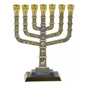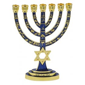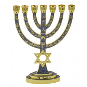Gold with Blue Enamel 7-Branch Menorah, Judaic Emblems and Star of David 9.5Height: 9.5"$57.74 -