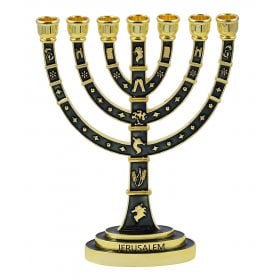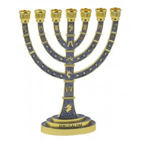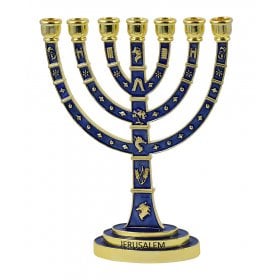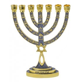 Seven Branch Gold Menorah, Dark Blue Enamel Plated with Judaic Symbols 9.5Height: 9.5"$57.74 -