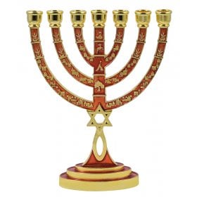 Seven Branch Menorah with Jerusalem Images & Judaic Motifs, Red and Gold - 9.5"Height: 9.5"$57.74 -