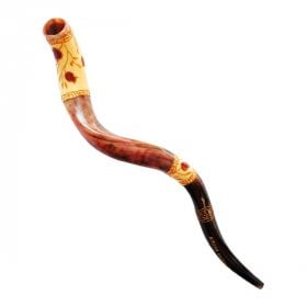 The shofars in this category are special connoisseur's items. Revel in the hand painted Yemenite Shofars, artistically rendered with minute detail and stunning colors, each one crafted with an individual message, with Biblical or Jerusalem themes. The artist is Irina Rabinovich and she applies her prodigious talent learnt in Siberia Russia. the Temple in jerusalem Shofar portrays in white and gold hues, the Jewish Temple in Jerusalem, seemingly in light and fire, as it were. The Noah's Ark shofar majestically portrays wild animals in lifelike shades, showing a lifelike scene from the Bible. The popular Israeli artist Eretz lovingly encases the Shofars in harmonious colors and themes, sometimes further enhancing them with metal plates engraved with Jerusalem designs. The most popular is a pomegranate design in cream and maroon shades with touches of metallic gold color around the edges. These shofars are majestic conversation pieces and display expert craftmanship. The ethnic designs of Israel artist Eva Arbib are imaginative and unexpected, with her awesome combination of material, beads, tassels and more to create an innovative and distinctive Shofar style. The oriental colors and materials transform the items into truly distinctive works of art.