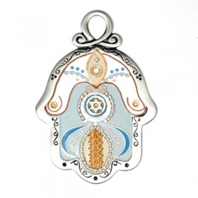 The Hamsa is an ancient Oriental amulet, reputed to have special powers of protection from the Evil Eye. It also brings with it positive energy and provides good luck blessings. The word Hamsa is connected to the Hebrew word “Hamesh” - five, referring to the Five Books of Moshes. The Hamsa hand is also known as the Hand of Miriam. It was in the merit of Miriam, sister of Moses and Aharon, that the Jewish People were provided with water in the desert. So, her name came to be associated with blessing and protection. A fish design on Hamsa strengthens the protection since fish live in water, where they are immune to the powers of the Evil Eye. The usual display of the Hamsa is three extended fingers in the middle and a curved thumb or pinky finger on either side.